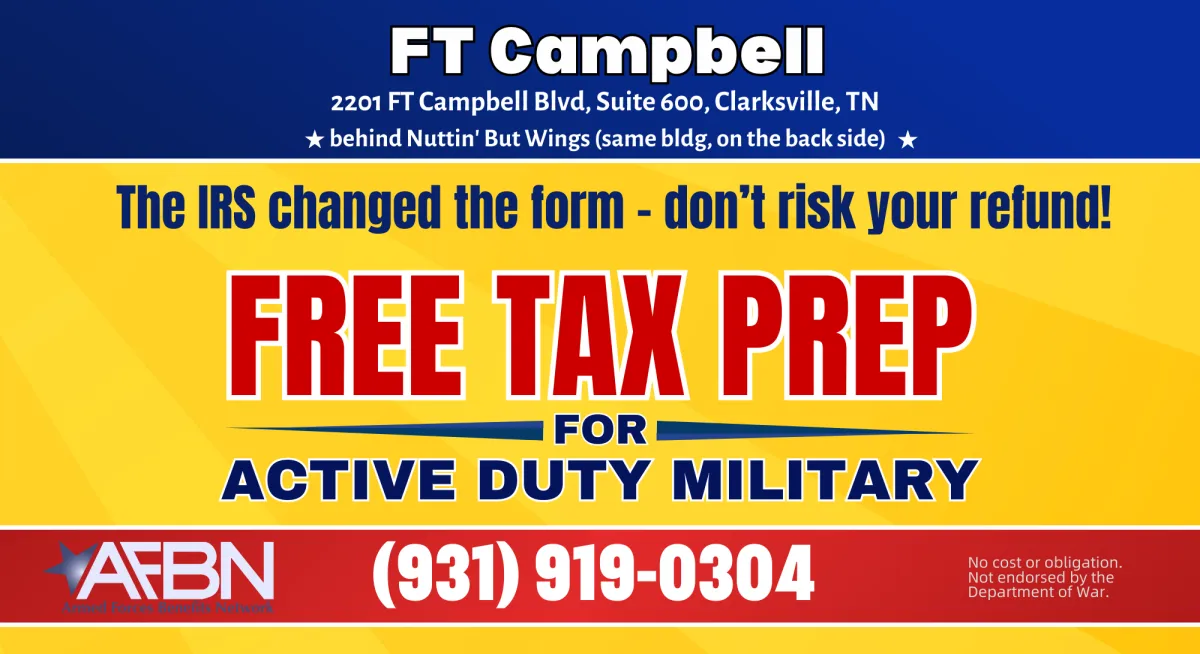 Yes. If you are active duty we prep and file your taxes for free. There is no obligation or fees. Filing your taxes with AFBN - Fort Campbell is easy and convenient.